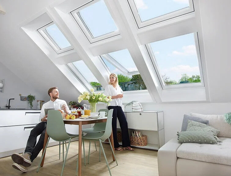 Ein Mann und eine Frau in einem modernen Zimmer und drei Dachfenster, wovon eines geöffnet ist.