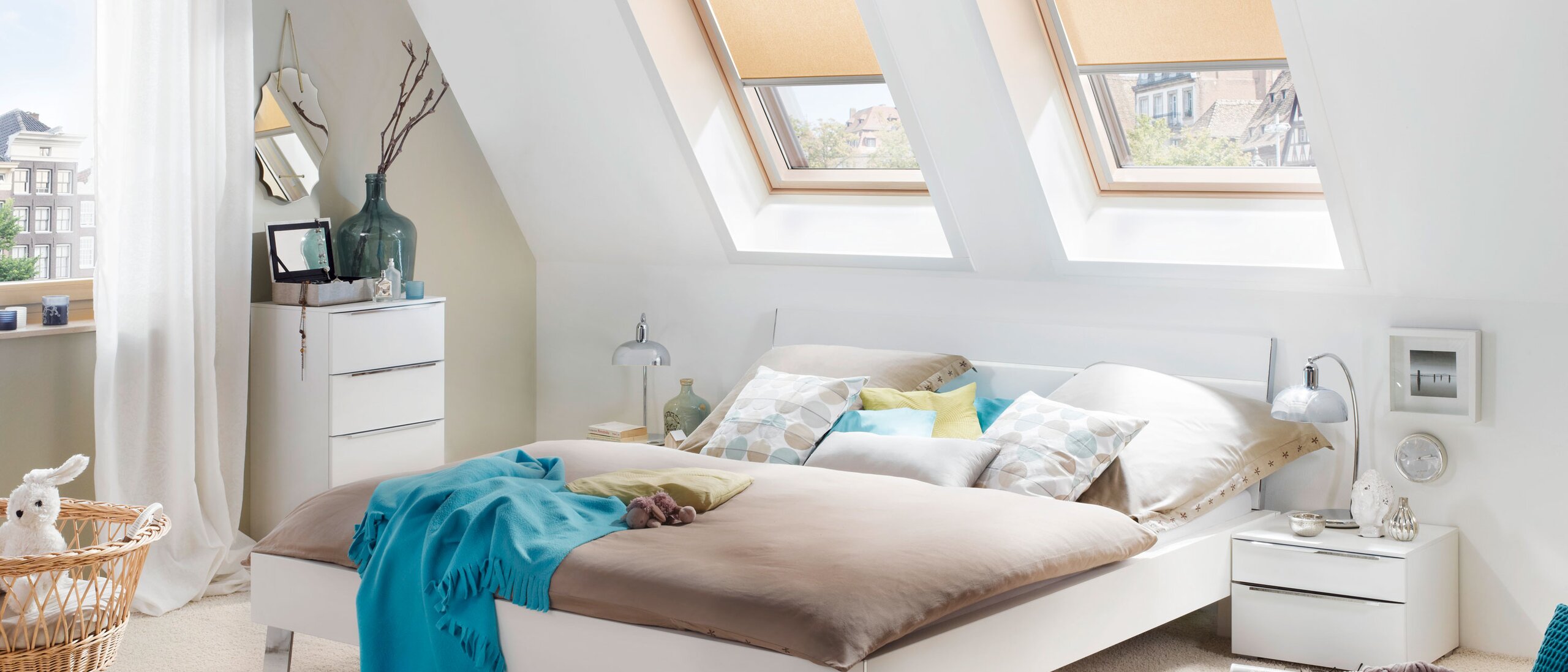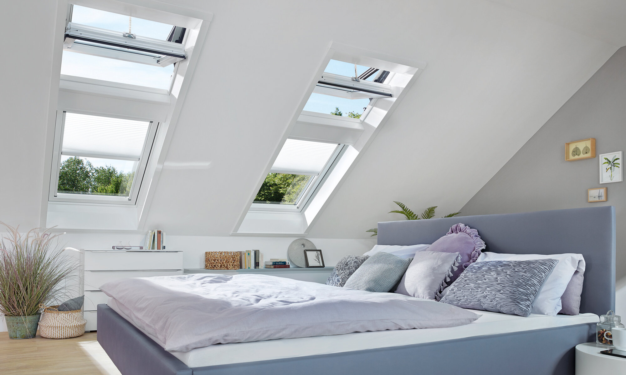 Schlafzimmer mit vier großen Dachfenstern, bei den jeweils zwei übereinander stehen. Die oberen Dachfenster sind geöffnete Schwingfenster.